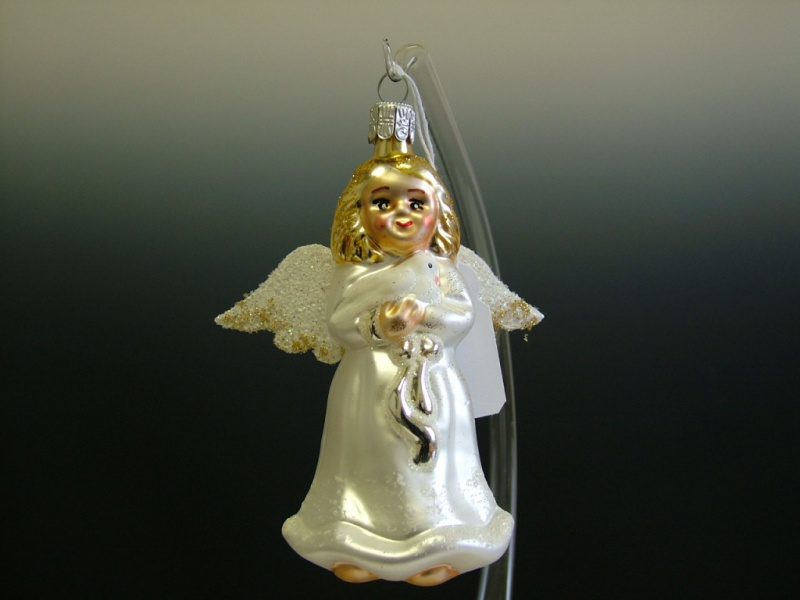 Vánoční skleněná ozdoba - Anděl s holoubkem velký, bílý, mat, dekor