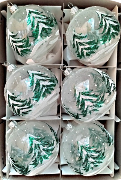 Vánoční skleněné koule 10cm, čiré, zelený dekor stromů, 6ks