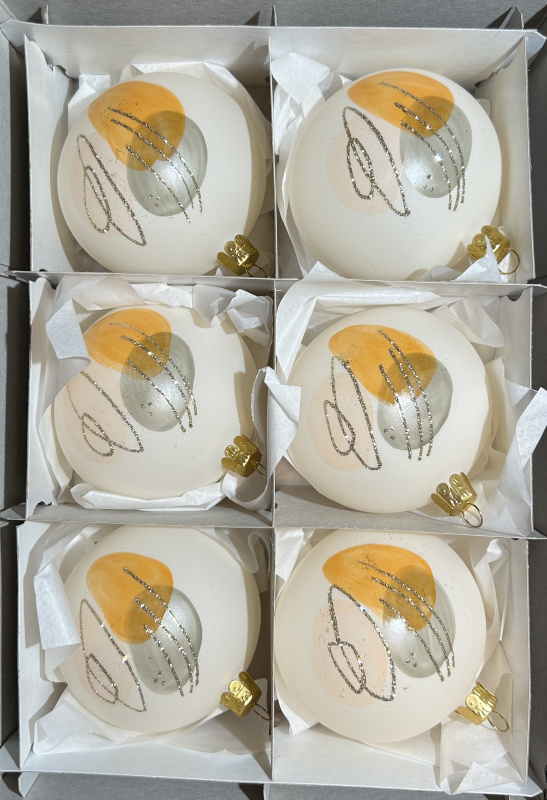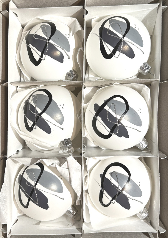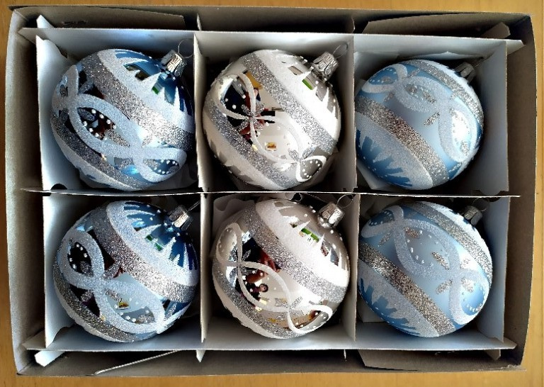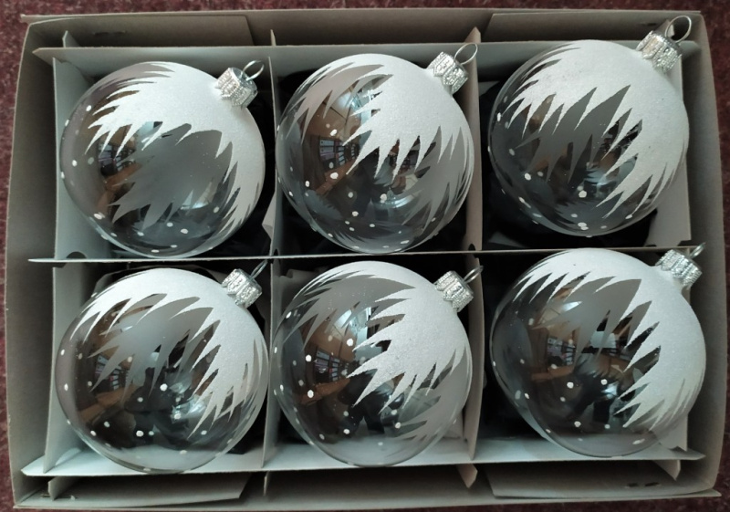 Vánoční skleněné koule 7cm, hladké, bílý mat, stříbrný dekor, 6ks