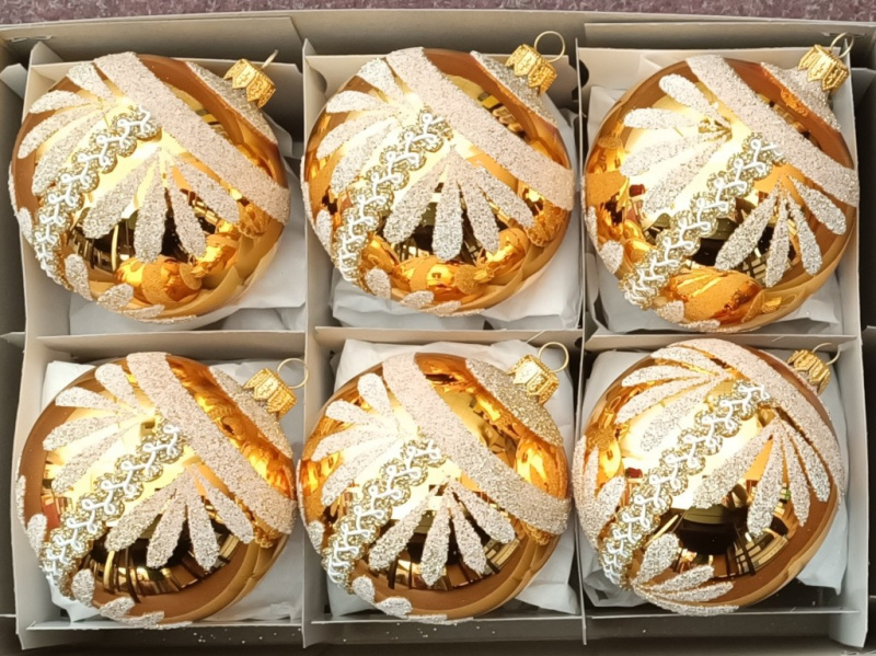 Vánoční skleněné koule 8cm, hladké, zlaté, lesk, bílý dekor