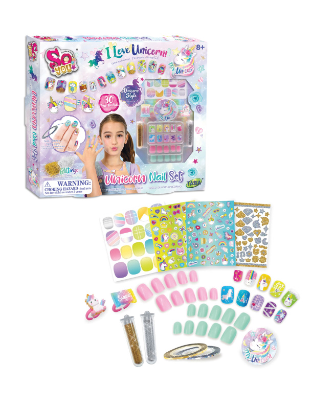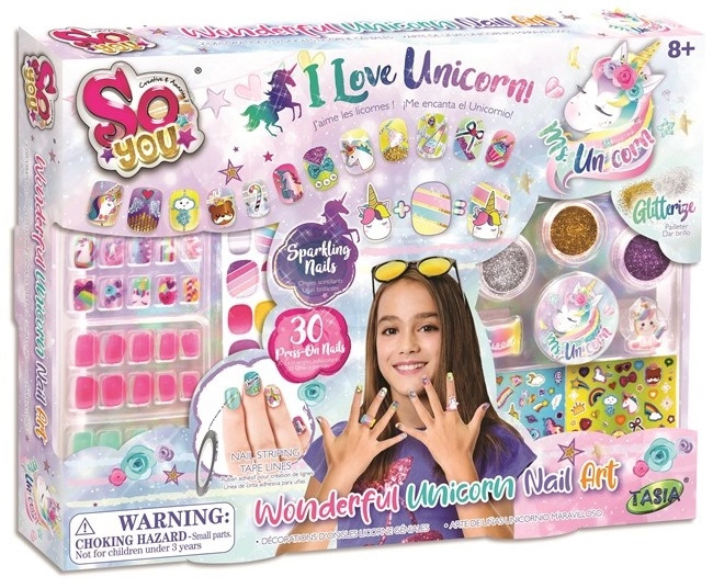 TASIA - Sada 30 nalepovacích nehtů s jednorožcem a glitry