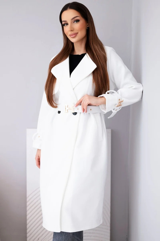 Dámský ecru kabát Kesi s páskem a zlatými přezkami