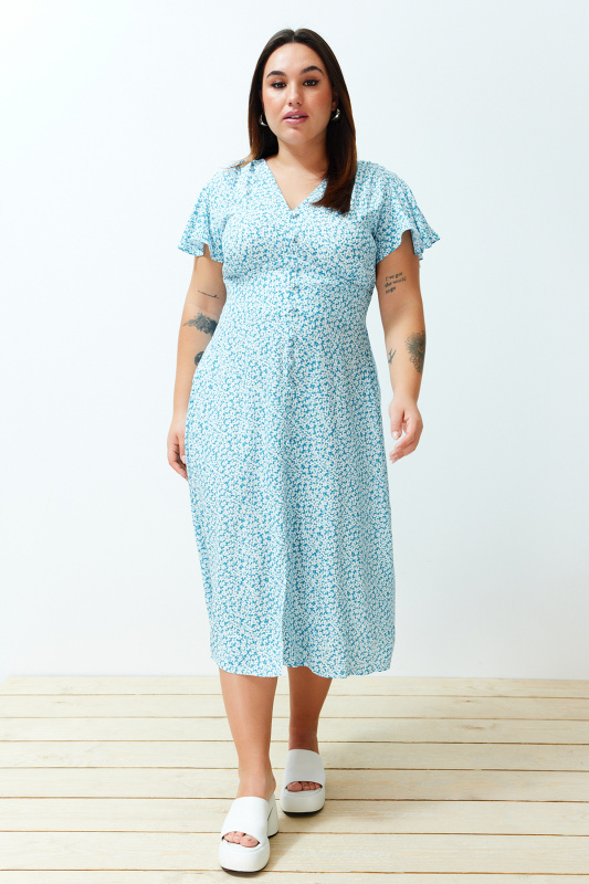 Trendyol Blue Floral Double Breasted Viscose Midi Woven Dress