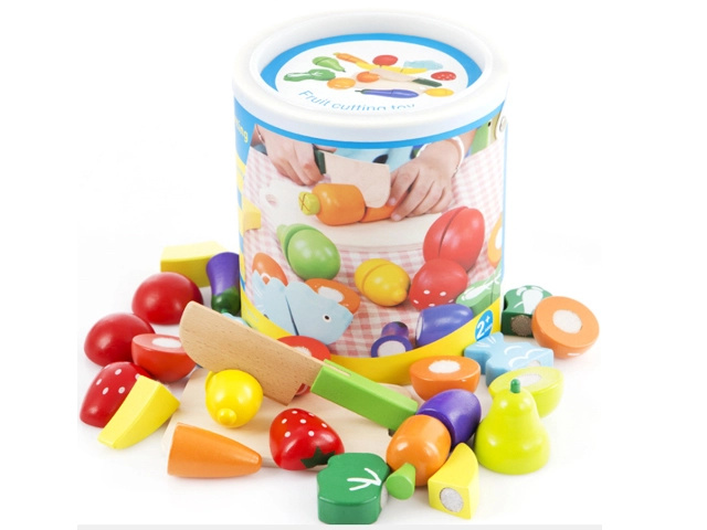 Dřevěné ovoce a zelenina na krájení v kyblíku