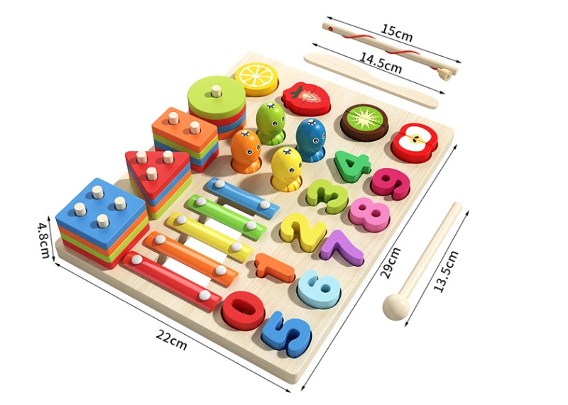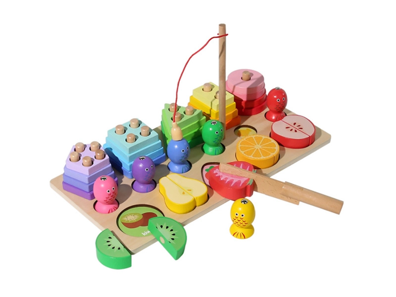Dřevěná montessori skládačka 3v1 – ovoce, rybičky a krájení