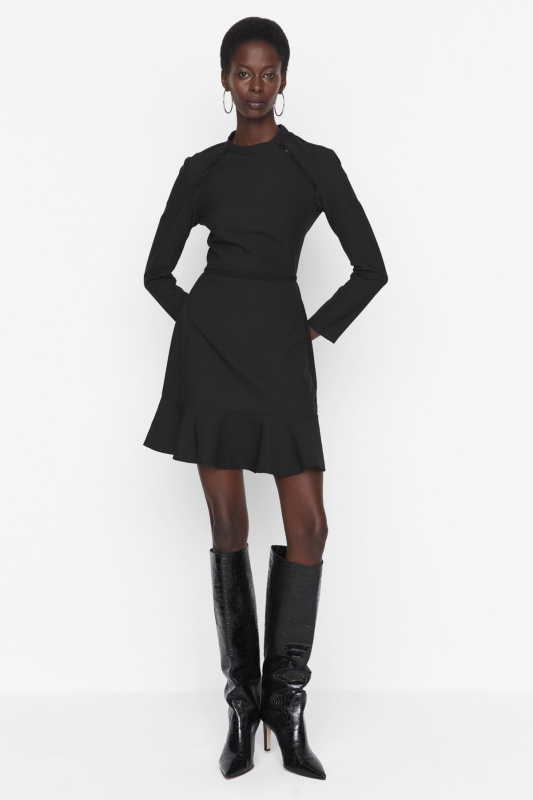 Trendyol Black A-Line Ruffle Detailed Stand Collar Mini Lined Chiffon Woven Winter Dress