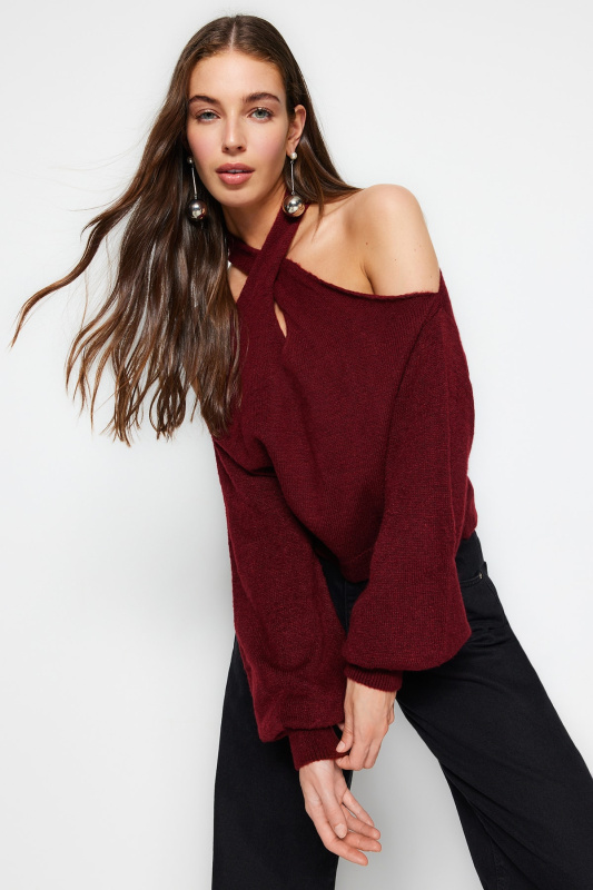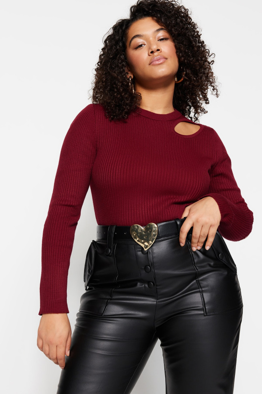 Trendyol Curve Plum Cut Out Detailed Crew Neck Thin Knitwear Sweater